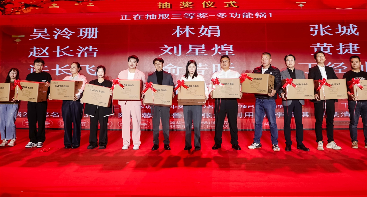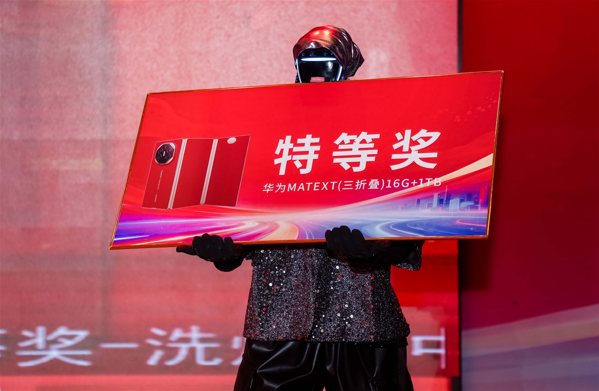 现场精彩纷呈,吉他弹唱、网红舞蹈、机器人表演、大合唱等节目轮番上演。多轮抽奖环节惊喜连连,实用家电、潮流数码奖品好礼轮番送出,华为 Mate XT 三折叠手机压轴大奖,将气氛推向顶峰。